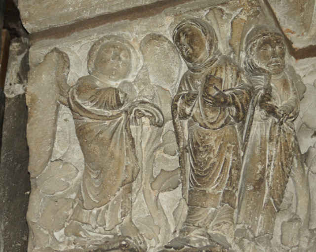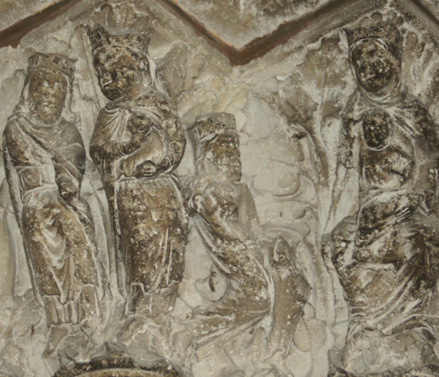 Sur les tailloirs : Une première scène peu lisible : sous un petit bois les chevaux des rois mages sont gardés par leurs serviteurs. Pendant ce temps les rois mages sont reçus à la scène suivante par Hérode..jpg)