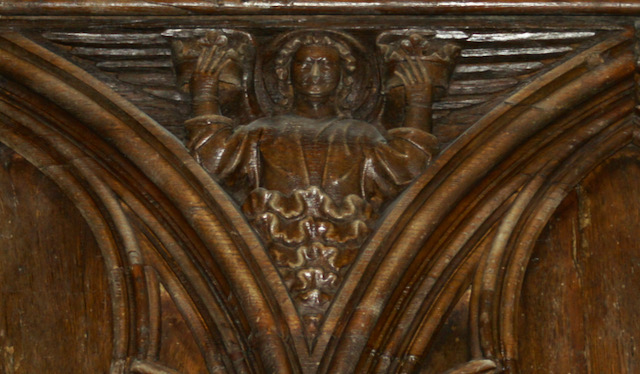 L'ange à gauche des stalles sud porte une seule couronne ; toujours la même disposition alternée d'anges et de sujets.