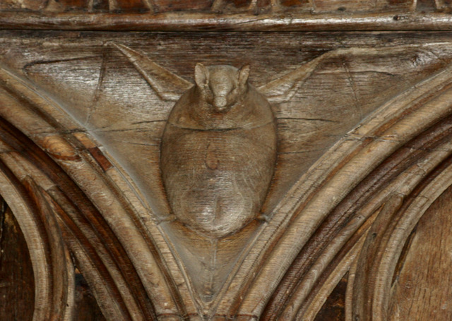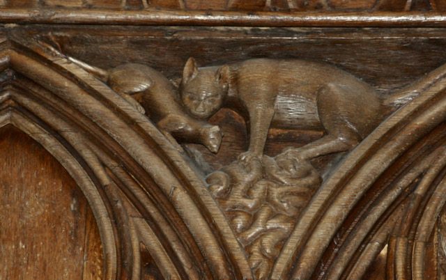 C’est tout en haut des dossiers que se situent des sculptures exceptionnelles, dans les écoinçons, c’est-à-dire entre les arcs qui délimitent chaque dossier. Un écoinçon sur deux est orné d’un ange, qui tient une couronne de chaque côté. En alternance avec les anges figurent des personnages, des scènes de la vie quotidienne, des motifs allégoriques, des créatures monstrueuses, des animaux.