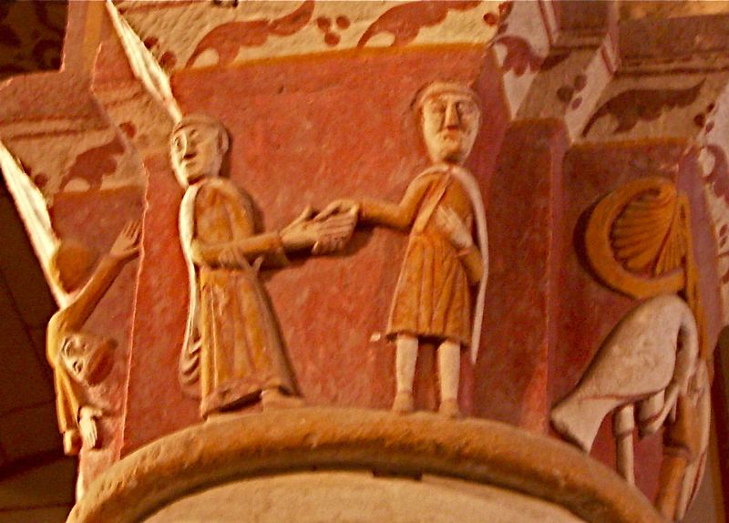 Des chapiteaux en grès rouge du porche de l'église Saint-Michel et Saint-Gandolphe à Lautenbach dans le Haut-Rhin représentent une très évocatrice histoire d'adultère.