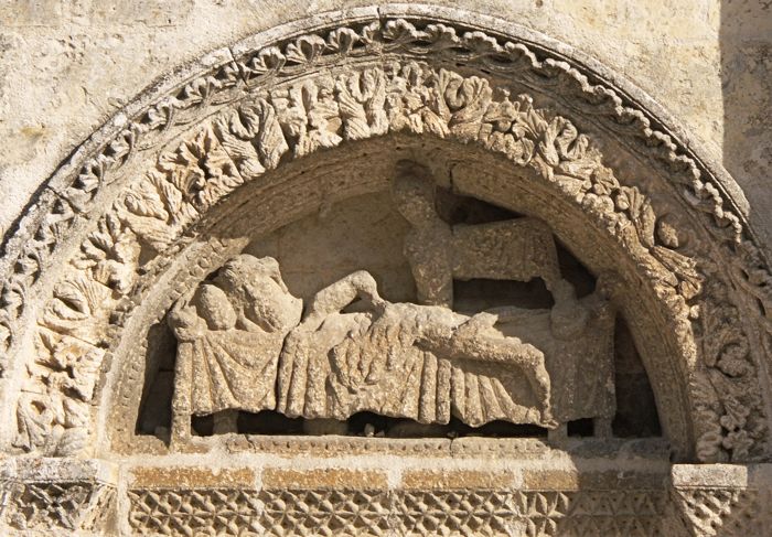 Au tympan de l'arcade aveugle latérale nord, on peut voir une sculpture en demi-bosse, assez détériorée, représentant un personnage barbu couché sur un lit, en partie couvert par une draperie, la tête appuyée sur la main droite, la main gauche et une jambe pendante en dehors du lit. A ses côtés se tient un personnage debout supportant une draperie sur son bras étendu.
