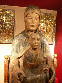 ** Ci-dessus, la statue de Notre-Dame du mont Cornadore en bois polychrome, assise sur un trône, tient l'Enfant sur ses genoux ( XII e siècle ).