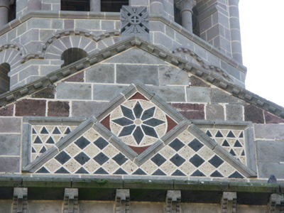 L' emploi par alternance de pierres sombres volcaniques et claires met en valeur les frises de rosaces, les formes triangulaires et les losanges. On retrouve ici, bien qu'avec une grande sobriété, l' ornementation de mosaïques fréquemment rencontrée en Auvergne. Noter également la croix maltée au-dessus du pignon ainsi que les modillons à copeaux.