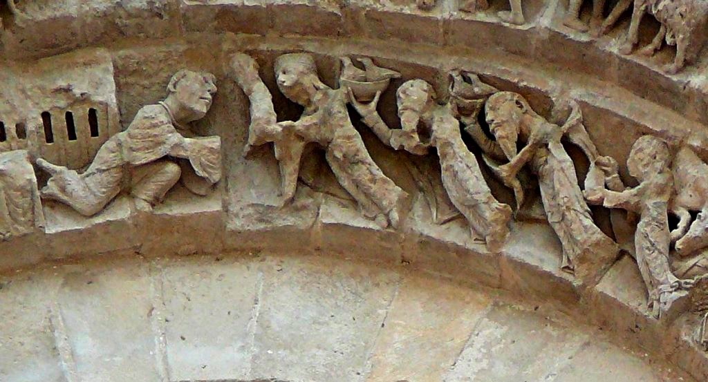 La Présentation au Temple. Siméon s'agenouille pour recevoir l'enfant des mains de Marie. Derrière celle-ci on note la présence de deux personnages soulevant une coupe contenant deux colombes ( Joseph et Joachim ? ) ; la prophétesse Anne clôt le cortège. " Le huitième jour, auquel l'enfant devait être circoncis, étant arrivé, on lui donna le nom de Jésus, nom qu'avait indiqué l'ange avant qu'il fût conçu dans le sein de sa mère. Et, quand les jours de leur purification furent accomplis, selon la loi de Moïse, Joseph et Marie le portèrent à Jérusalem, pour le présenter au Seigneur, - suivant ce qui est écrit dans la loi du Seigneur: Tout mâle premier-né sera consacré au Seigneur, -et pour offrir en sacrifice deux tourterelles ou deux jeunes pigeons, comme cela est prescrit dans la loi du Seigneur" Luc 2. 21-24. Eglise Sainte-Eulalie, Benet, Vendée.