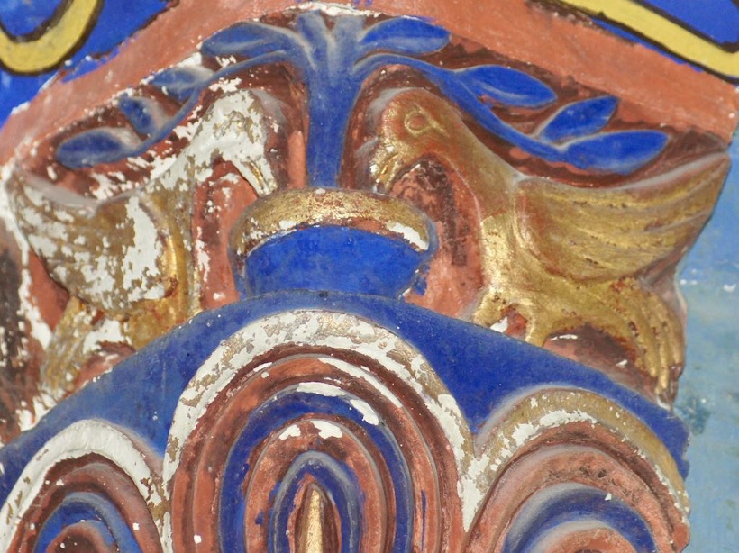 L'ornementation des voûtes, colonnes et chapiteaux est excessivement badigeonnée ou peinte de couleurs criardes.